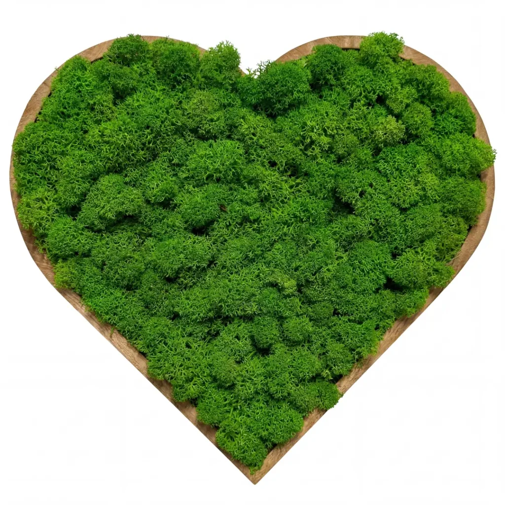 • Svieža farba: Srdce je vytvorené zo stabilizovaného svetlozeleného lišajníka, ktorý si zachováva svoju pružnosť a žiarivú farbu po mnoho rokov.