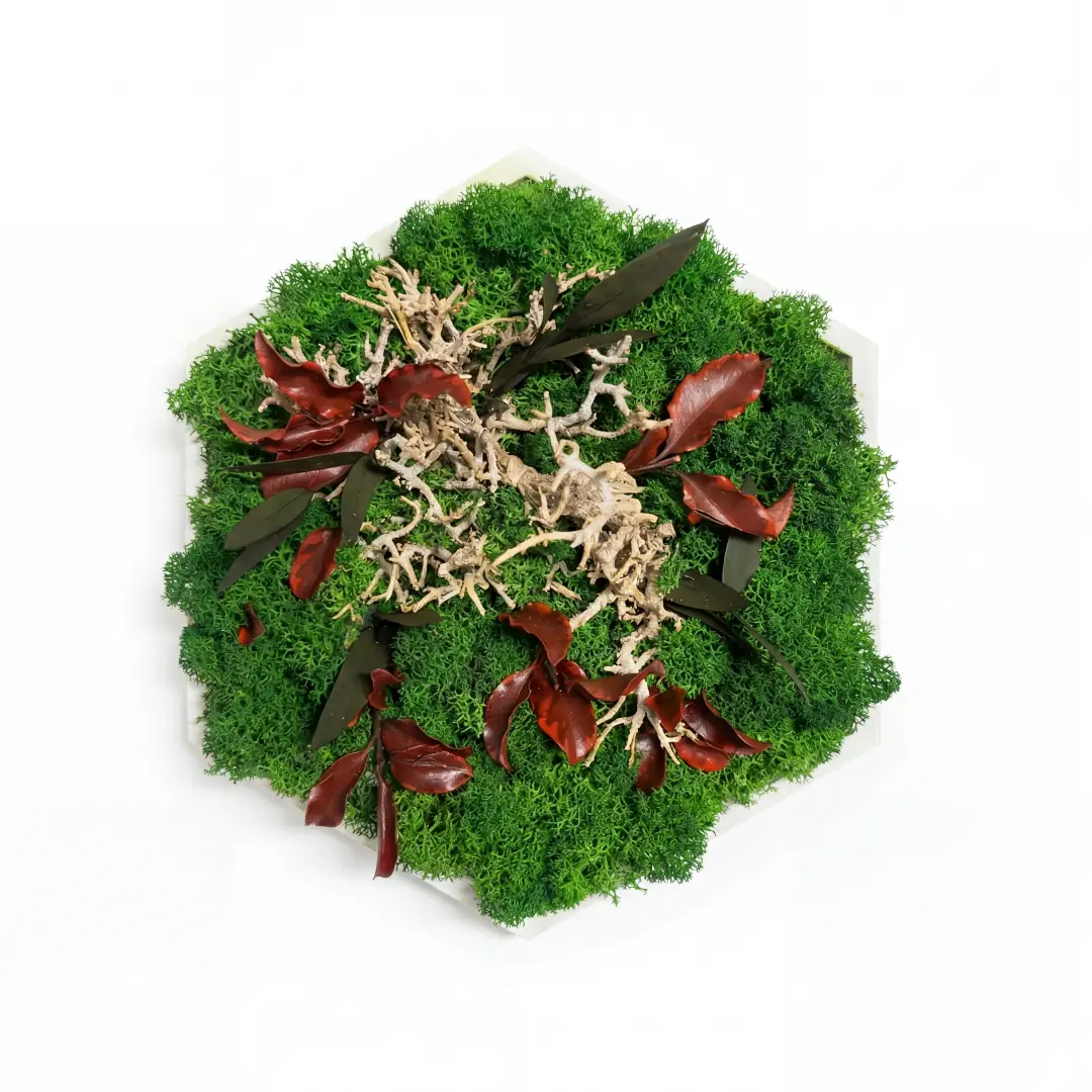 Vneste do svojho domova dynamiku prírody s naším unikátnym machovým obrazom. Moderný drevený rám v tvare 6-hranu s priemerom 20 cm v sebe ukrýva „Tanec lesa“ – hru rôznych odtieňov a textúr stabilizovaného machu, ktoré symbolizujú neustály pohyb a život v srdci divočiny.